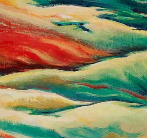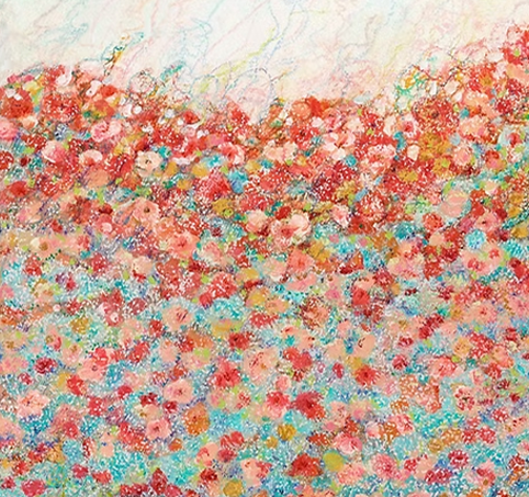 World, Tribal and Celtic music reveal harmonics, pronounced rhythms, and instrumental colors, which I listen for and interpret. Surprisingly, the paintings resemble gardens. Working more intuitively, I push past comfort and predictability, and let this vibrant music direct my process.