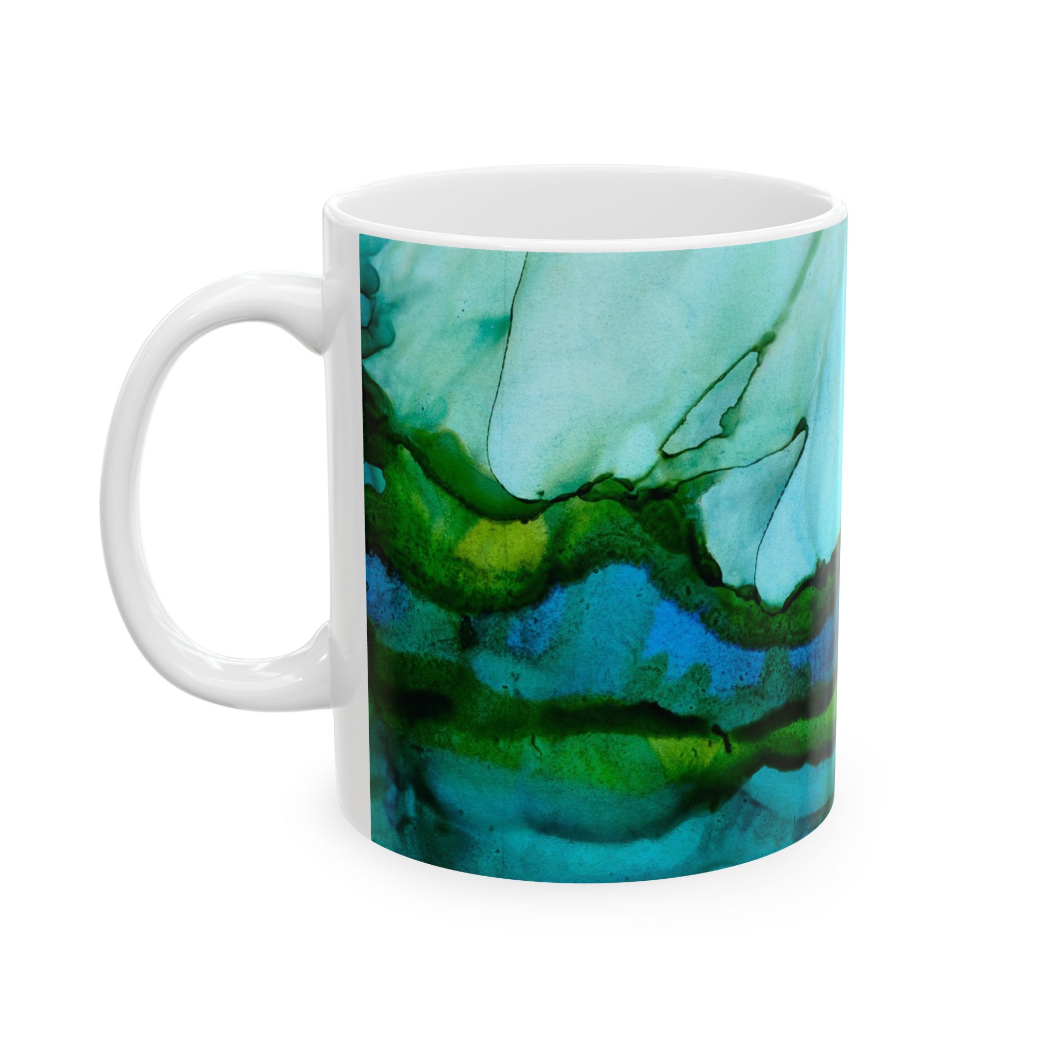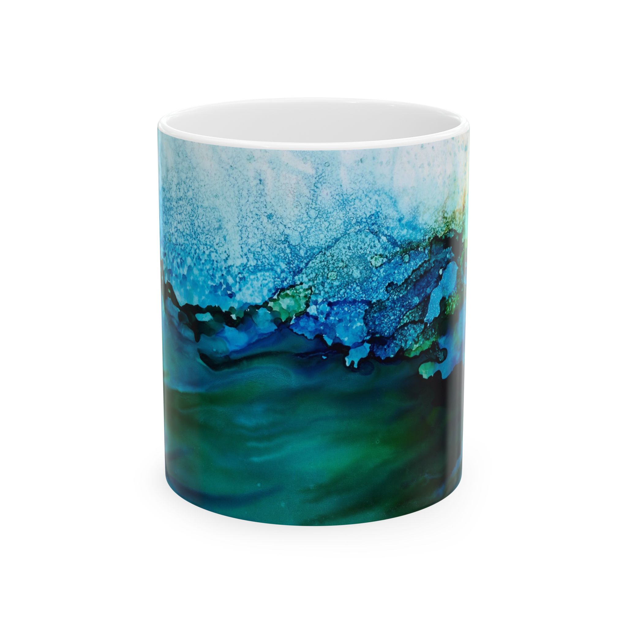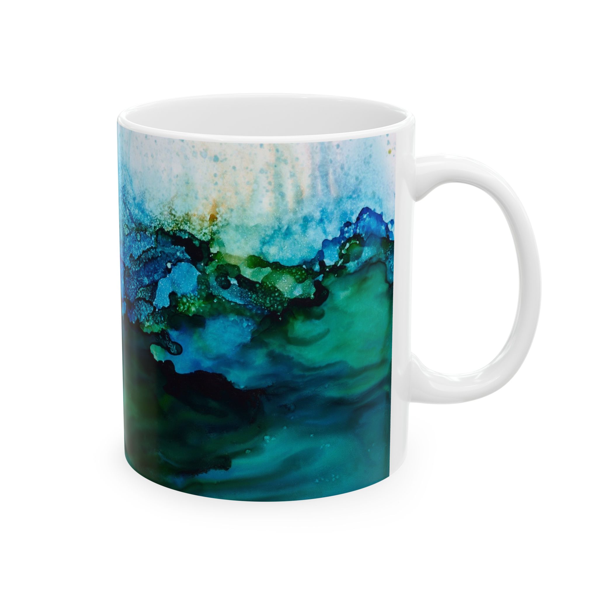 This glossy ceramic mug showcases ocean-inspired alcohol ink art, evoking wavy seaweed. With its wrap-around teal and aquamarine hues, it contrasts beautifully with the interior. The classic C-handle holds one or two servings—ideal for quiet moments like journaling, writing a letter or relaxing. Durable printing maintains its vibrant look through daily use.