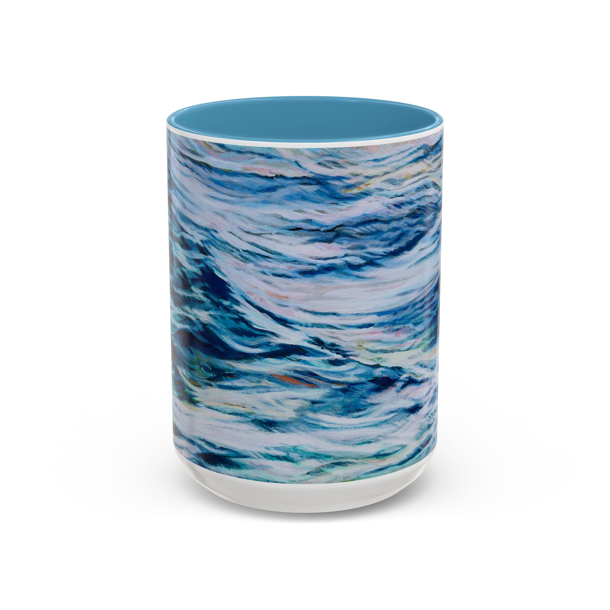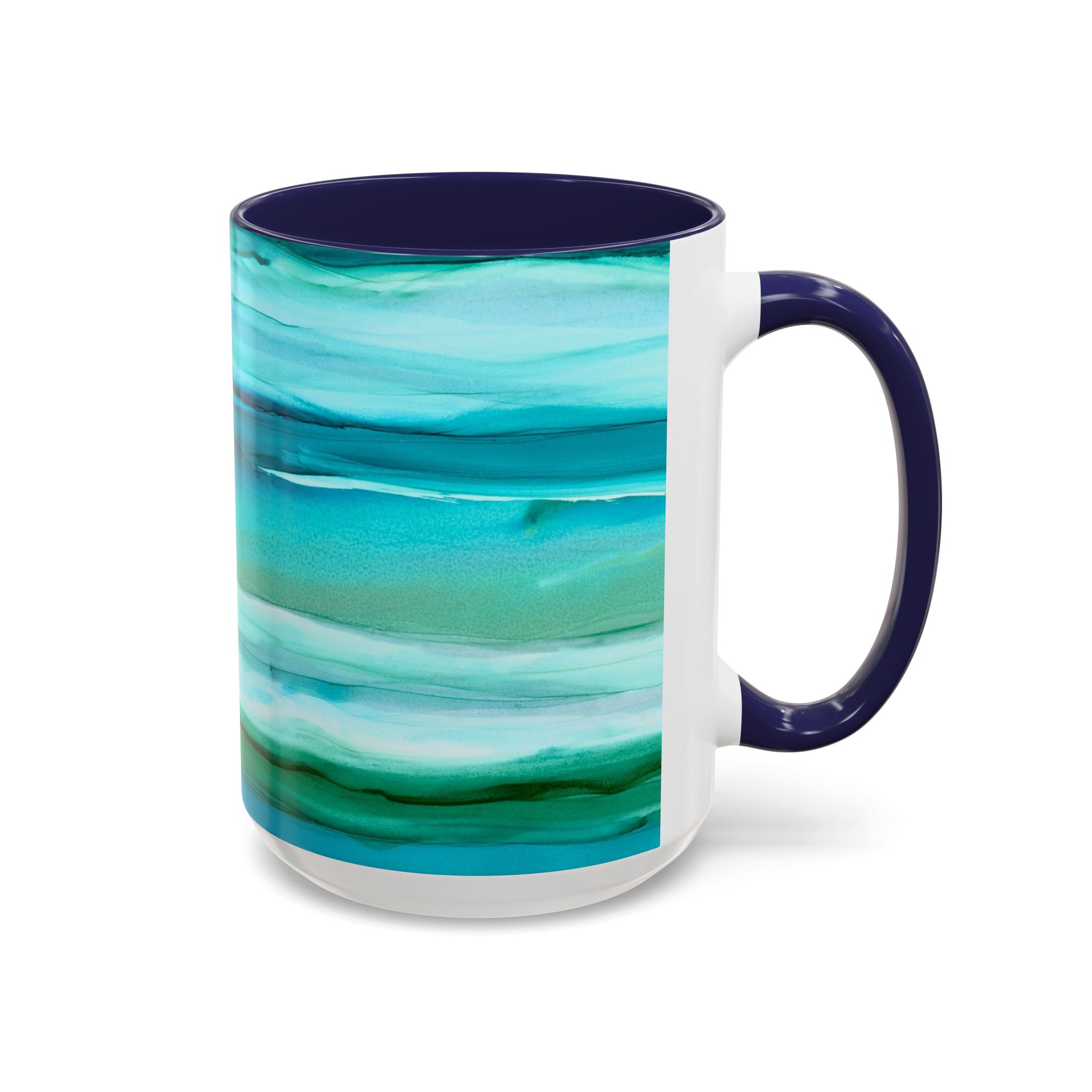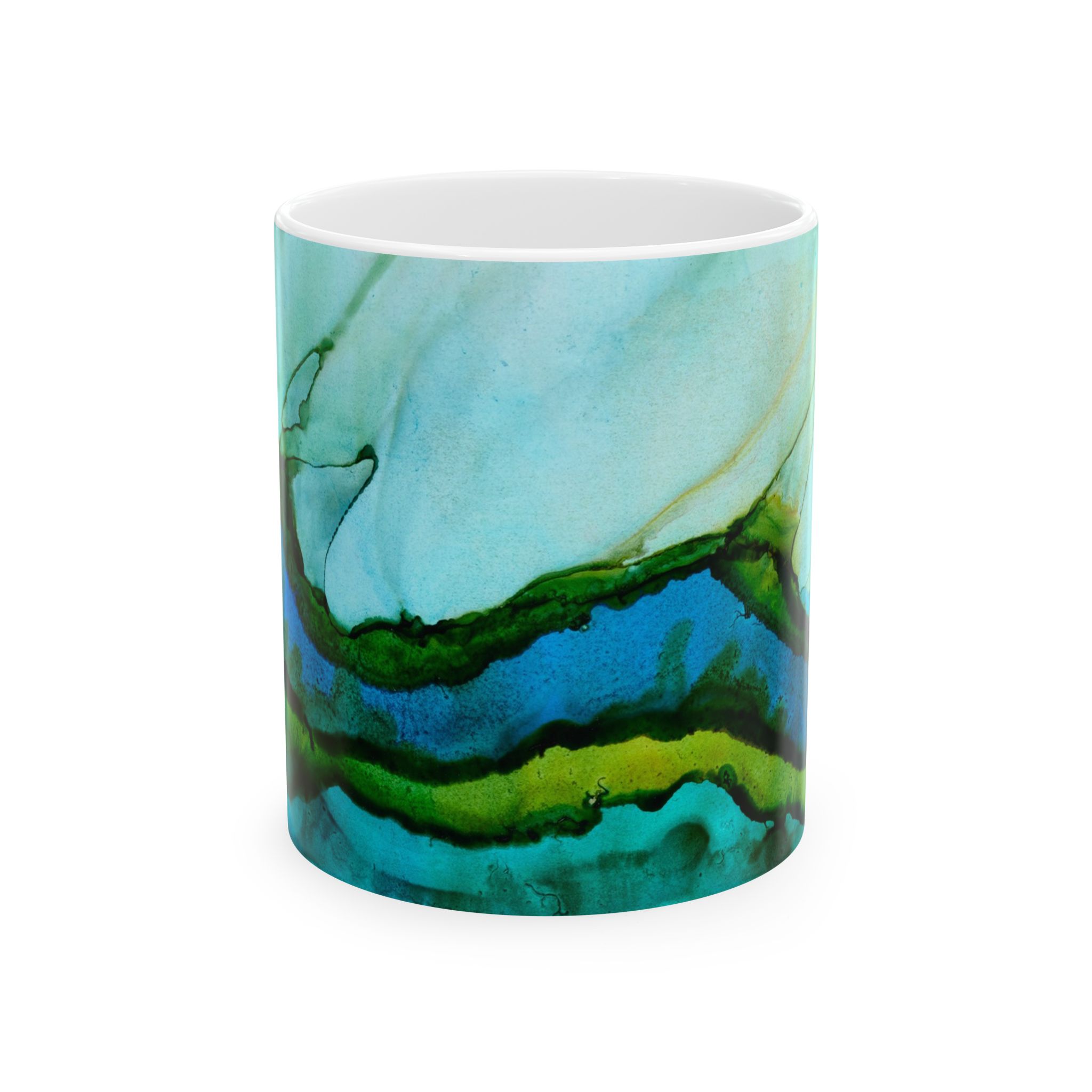 This glossy ceramic mug showcases ocean-inspired alcohol ink art, evoking wavy seaweed. With its wrap-around teal and aquamarine hues, it contrasts beautifully with the interior. The classic C-handle holds one or two servings—ideal for quiet moments like journaling, writing a letter or relaxing. Durable printing maintains its vibrant look through daily use.